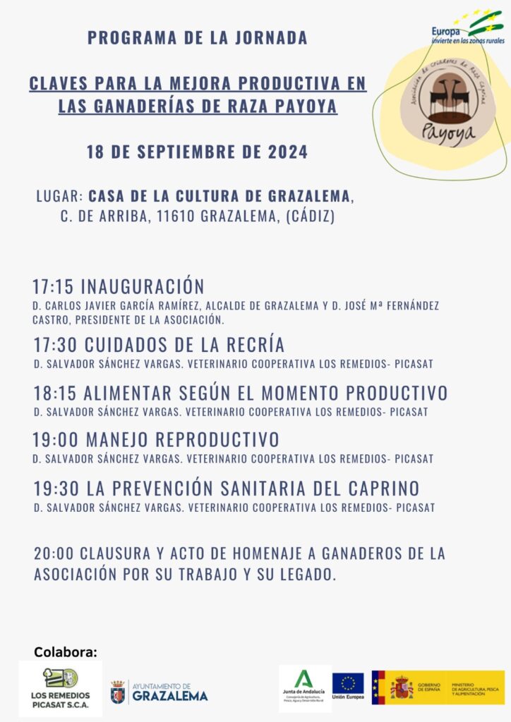 La Jornada Técnica se celebrará el miércoles 18 de septiembre en Grazalema. Contará con diferentes ponencias que darán claves para la Mejora productiva de en las ganaderías de la Asociación de criadores de raza caprina Payoya.